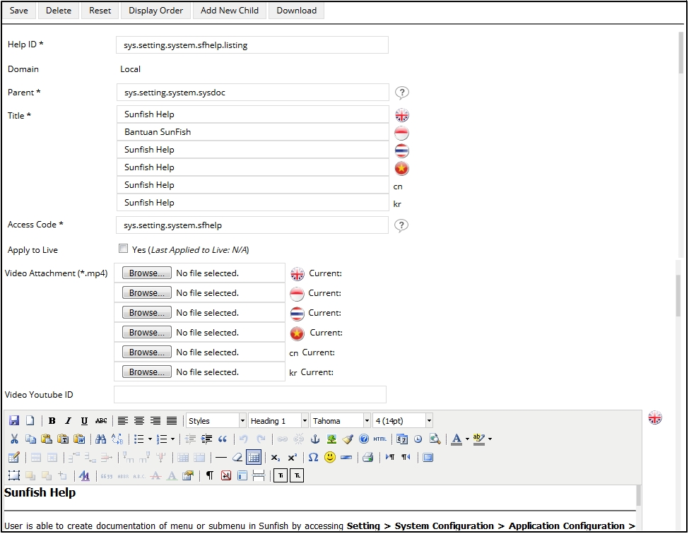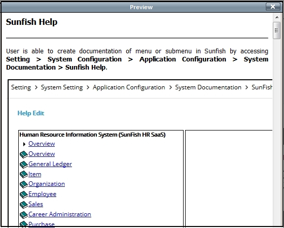 User is able to create documentation of menu or submenu in Sunfish by accessing Setting > System Configuration > Application Configuration > System Documentation > Sunfish Help.